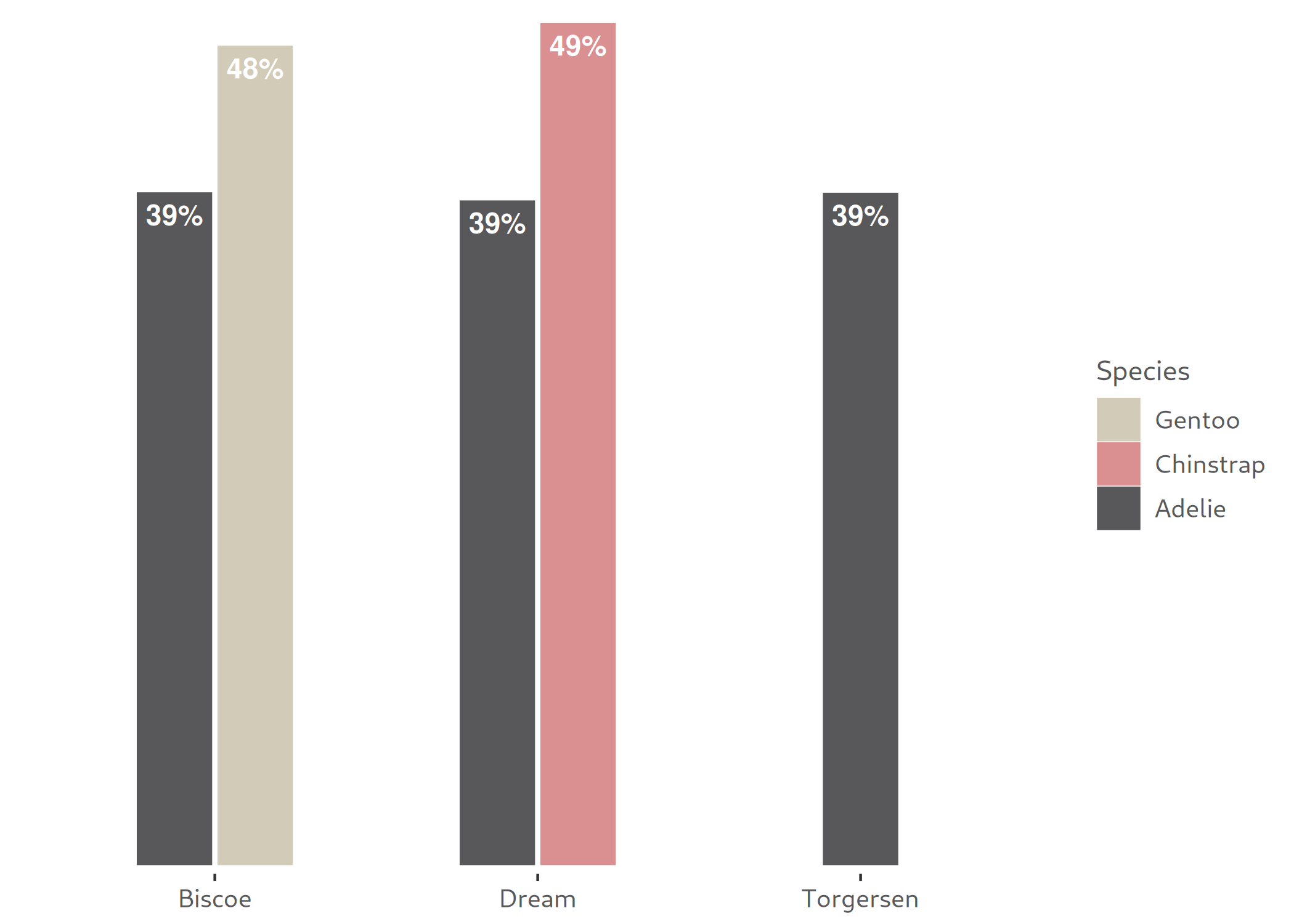 bar(df, island, mean_bl, species, group_title = "Species", flip = FALSE, add_text = TRUE, add_text_suffix = "%", percent = FALSE, theme = theme_reach(text_font_face = "plain", axis_y = FALSE))
