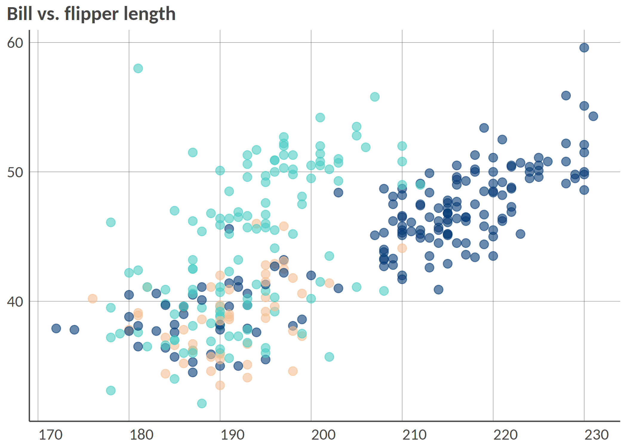 point(penguins, 'bill_length_mm', 'flipper_length_mm', 'island', group_title = 'Island', alpha = 0.6, size = 3, title = 'Bill vs. flipper length', , add_color_guide = FALSE)