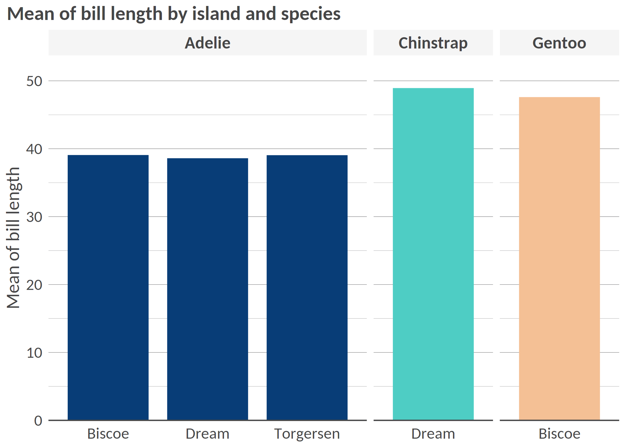 bar(df, "island", "mean_bl", "species", facet = "species", x_title = "Mean of bill length", title = "Mean of bill length by island and species", add_color_guide = FALSE)