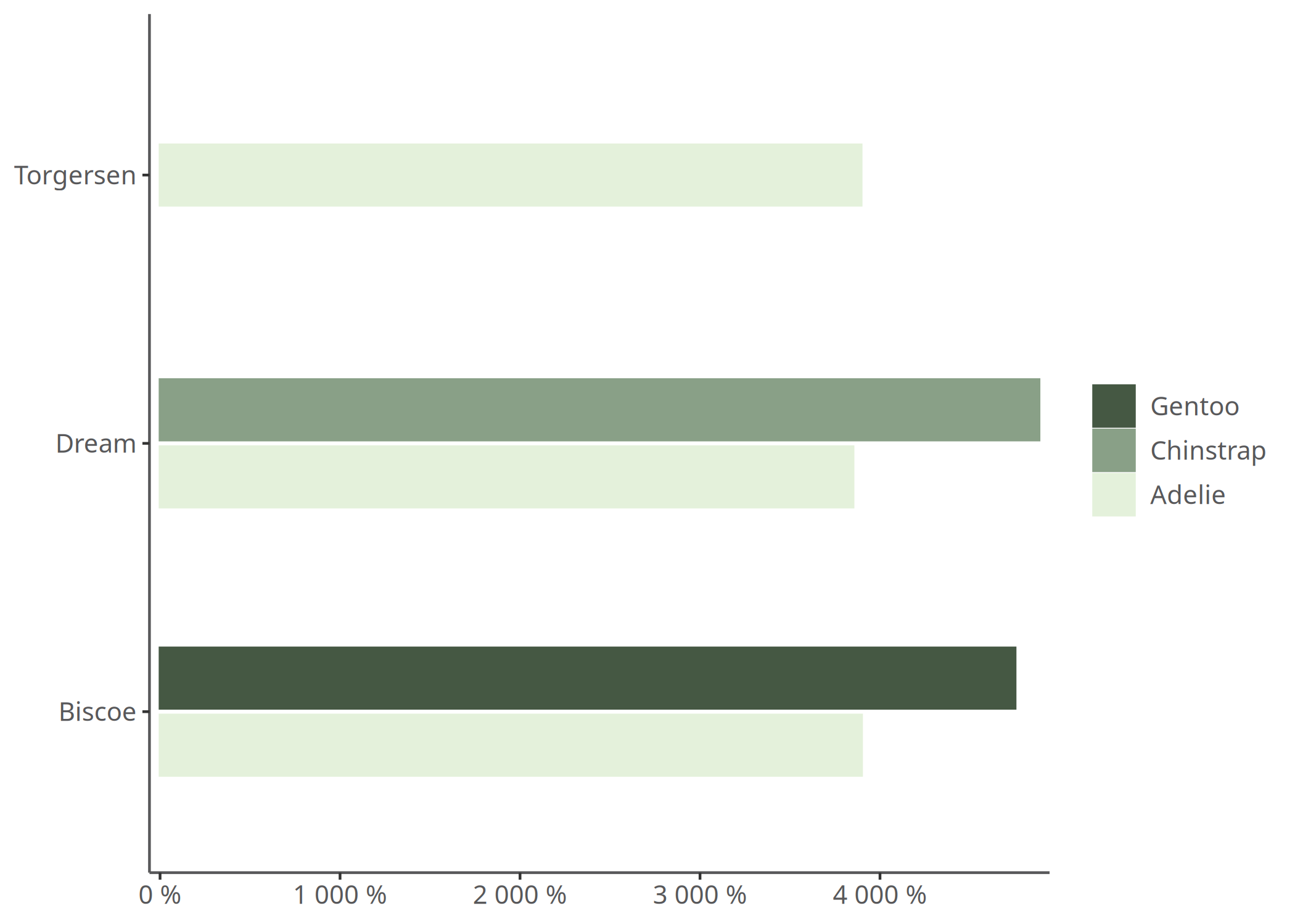 bar(df, island,mean_bl, species, percent = TRUE, theme = theme_reach(palette = "artichoke_3"))
