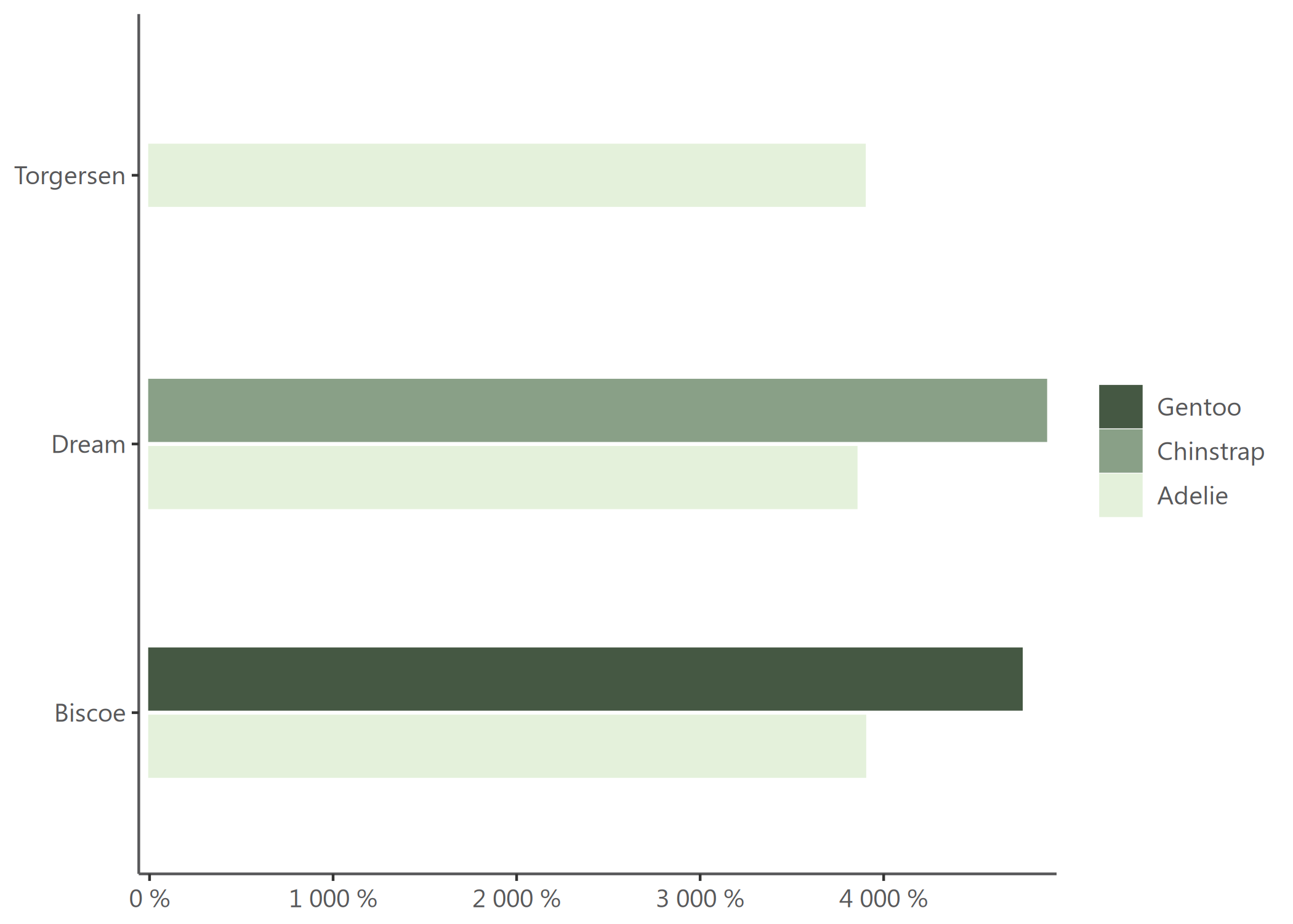 bar(df, island, mean_bl, species, percent = FALSE, alpha = 0.6, x_title = "Mean of bill length")