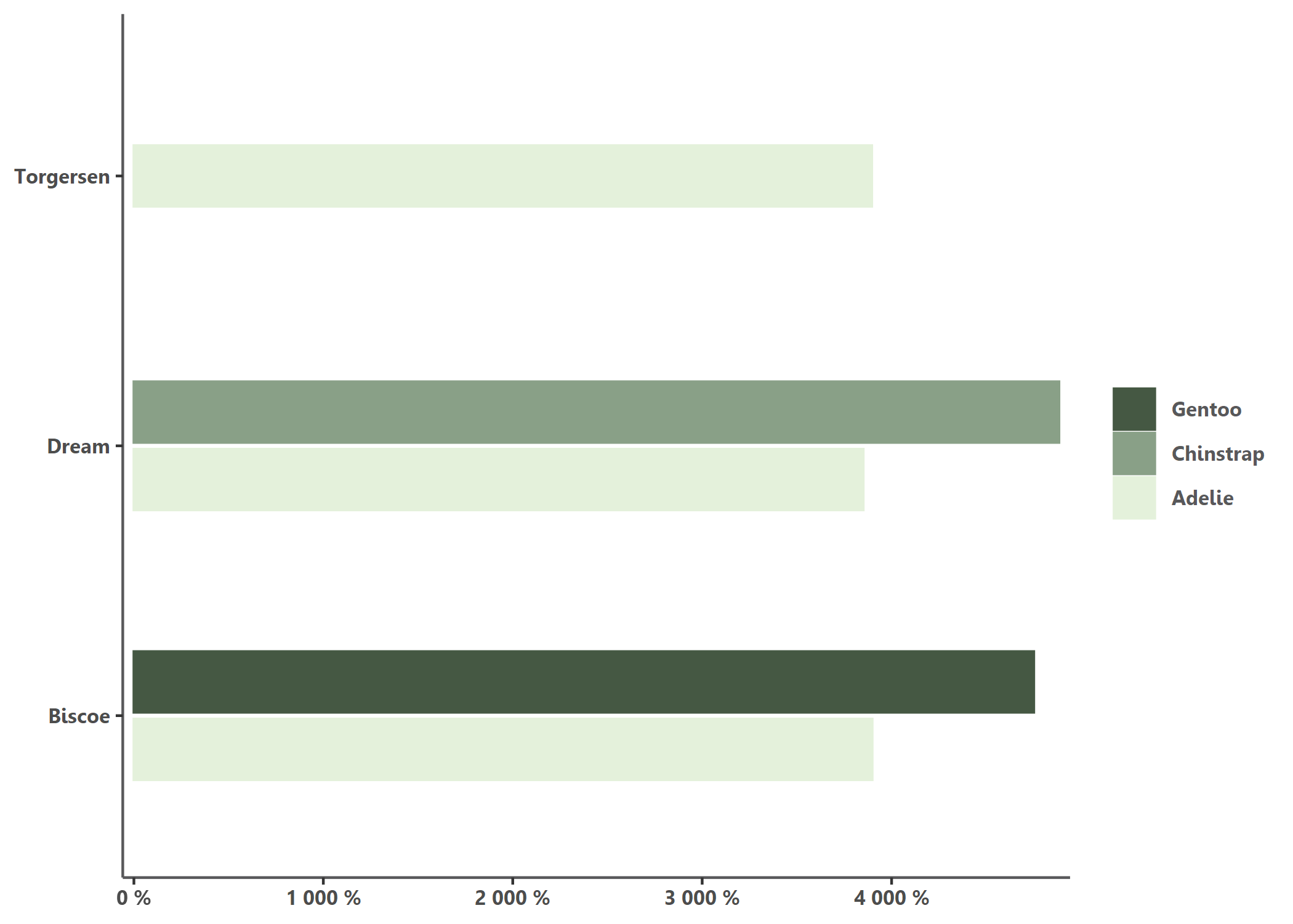 bar(df, island,mean_bl, species, percent = TRUE, theme = theme_reach(palette = "artichoke_3"))