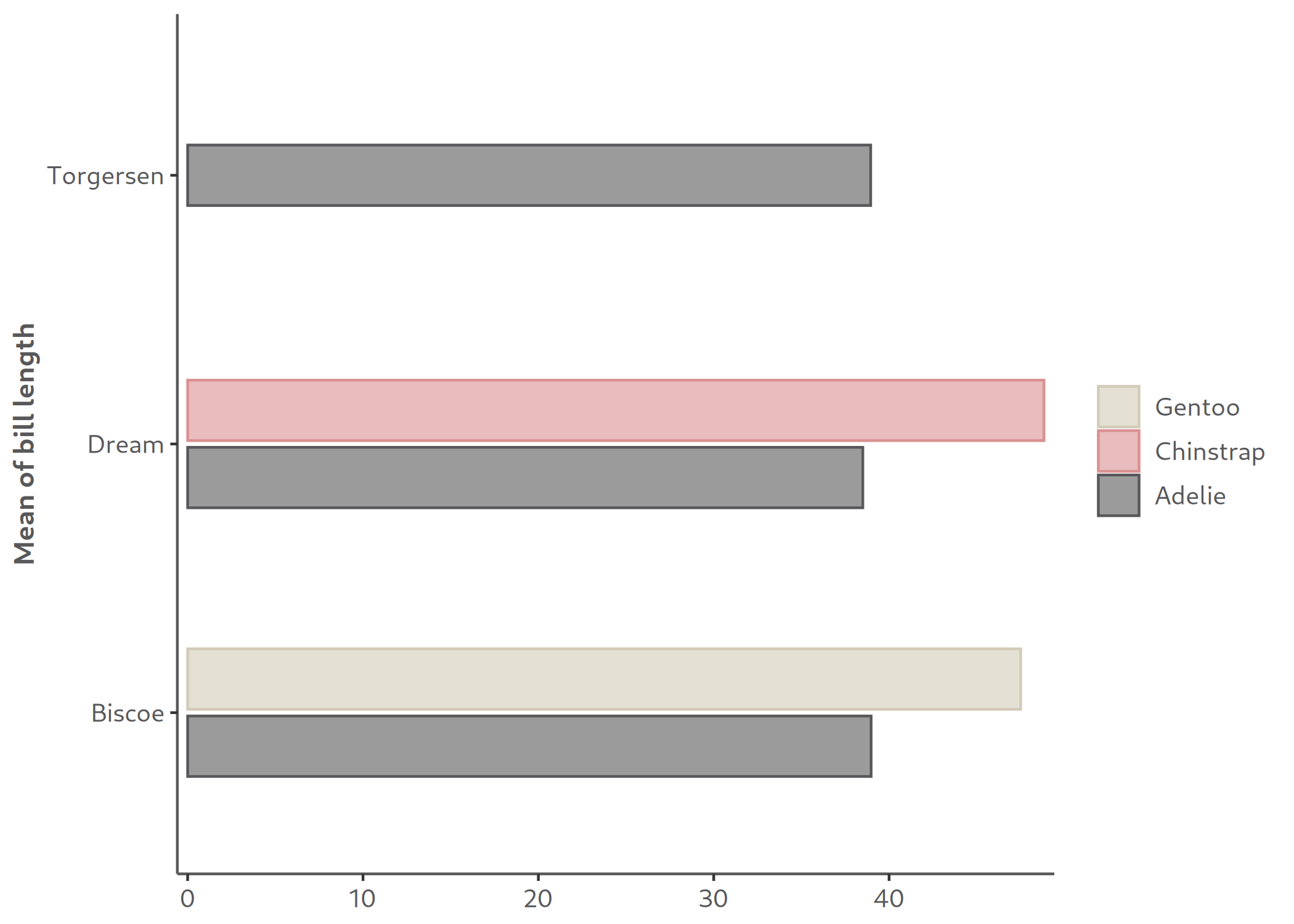 bar(df, island, mean_bl, species, percent = FALSE, alpha = 0.6, x_title = "Mean of bill length")